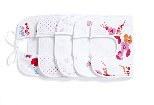 Hooded Towels and Bibs hand-finished with printed cotton percale and white bias trim. Offered in