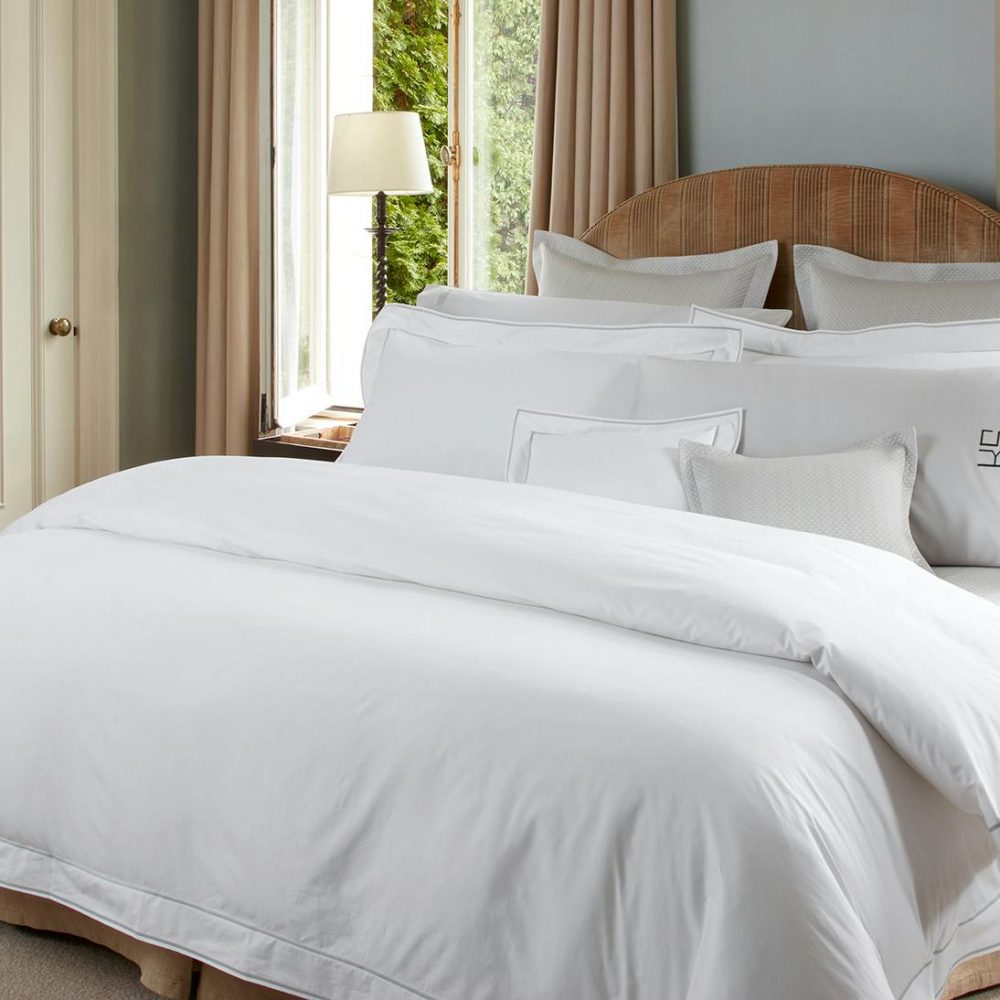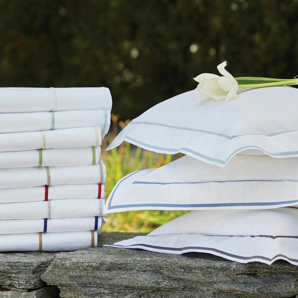 Tailored, traditional in the best way, our white Luca cotton percale is finished with two chic rows of satin stitching. Reminiscent of luxury liners, first class cabins, you’ll feel upgraded each time you slip into bed each night. Accent colors range from understated to slightly exotic.