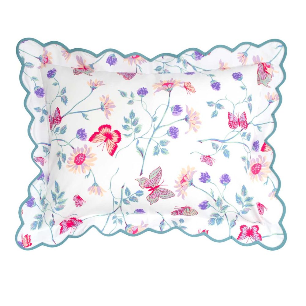 100% printed cotton percale with scallop border. Scallop border on Turquoise color way is DP Blue and on the Blue color way is white. Shown here as Turquoise print.