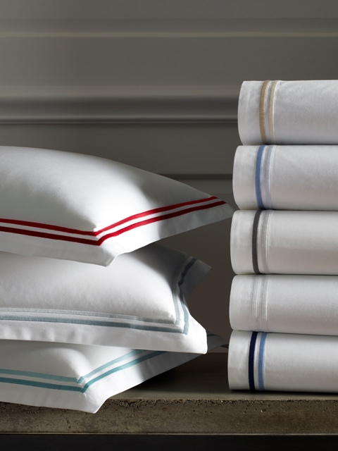 Our popular Sierra sheeting, in long-staple cotton percale is accented with a pair of crisp lines of satin stitch embroidery in colors from subtle to cheerful. A smart, European hotel feel that will give any bed space a modern, elegant air.