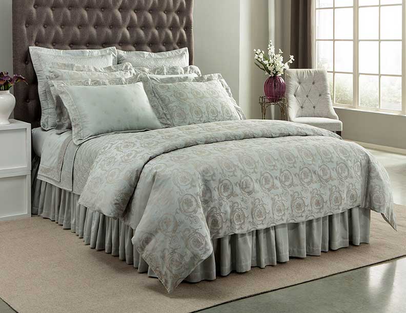 Firenze is a combination of a big or small acanthus pattern in a 600 thread count Egyptian cotton damask. Note:Steel Blue Pattern does not have a border. Flat sheets and pillow cases are small patterned finished with matching border. Shams are available in an allover big pattern(SHAM-A), small pattern with border(SHAM-B) or solid sateen with contrasting border(SHAM-C). (Standard, Queen, King, Euro, Boudoir, Neckroll). Duvet covers have small pattern reversing to big pattern with a knife edge. ( Twin, Full, Queen, King). Shown with quilted coverlet in royal sateen; many quilt patterns available.