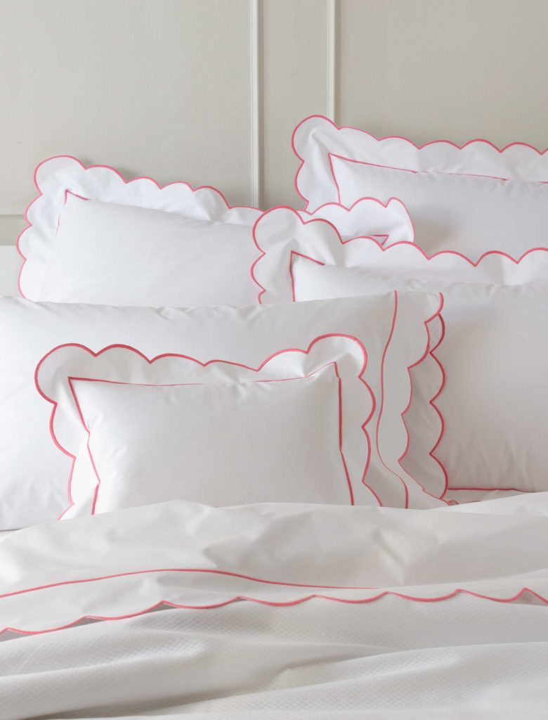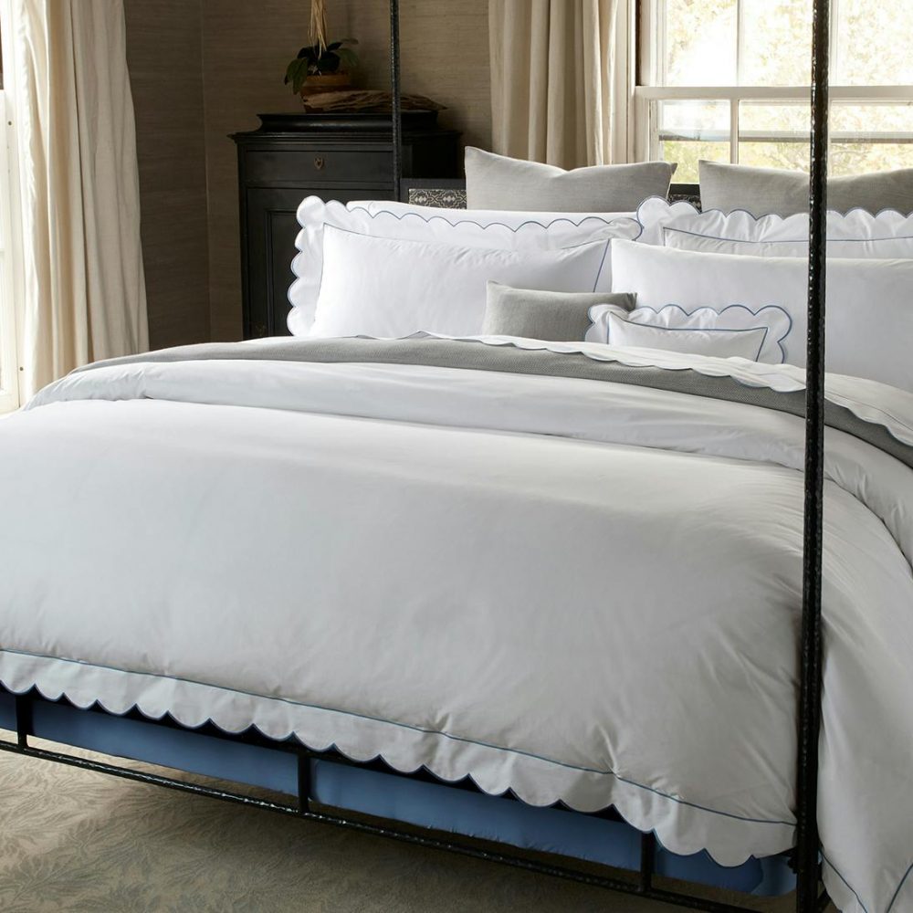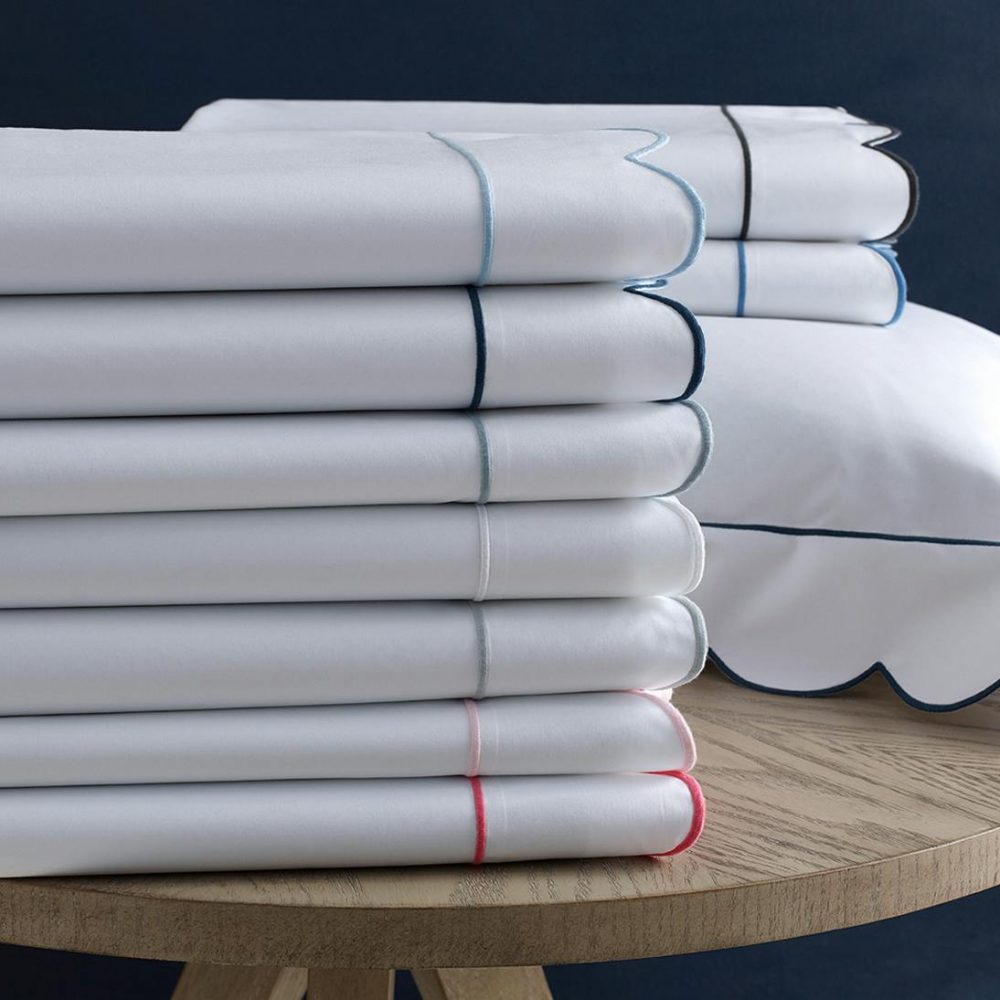 White percale finished with extra large scallop and satin stitch 500 thread count Egyptian cotton. Woven in Italy. Duvet covers have embroidery on flanges only. Fitted sheets have 17″ pockets. Duvet Cover has 3″ flange. Custom colors are available with 25% upcharge. made in the USA of fabric from Italy.