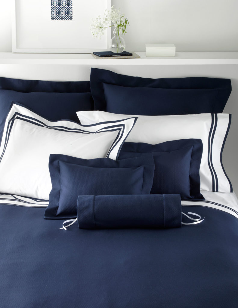 Easy-care pique finished with a straight hem. Duvet Covers have Positano cotton/poly sheeting on the reverse (200 tc Egyptian cotton/Polyester percale, made in Italy) and 2.5″ flange. Bed skirts are tailored with box pleats. Standard Sham, King Sham and Euro Sham have 2.5″ flange, and Boudoir Sham has 2″ flange.