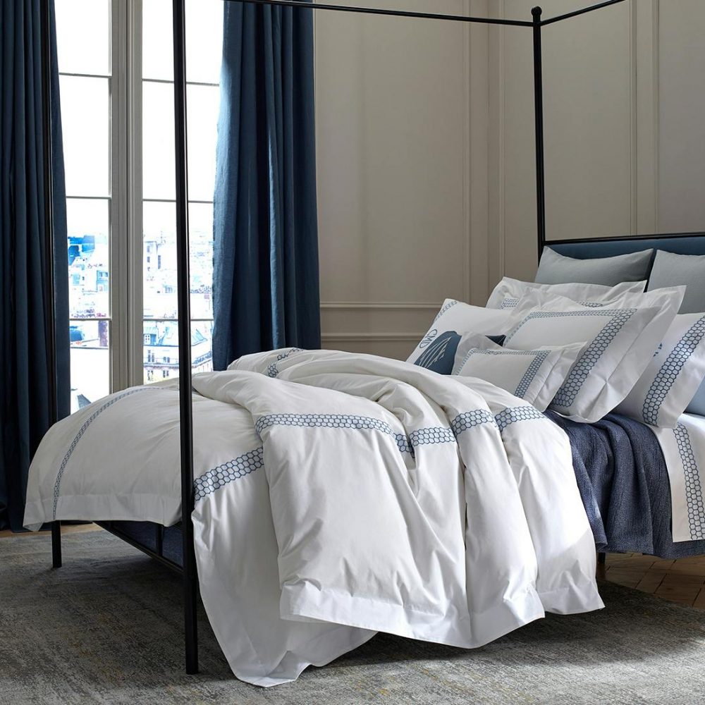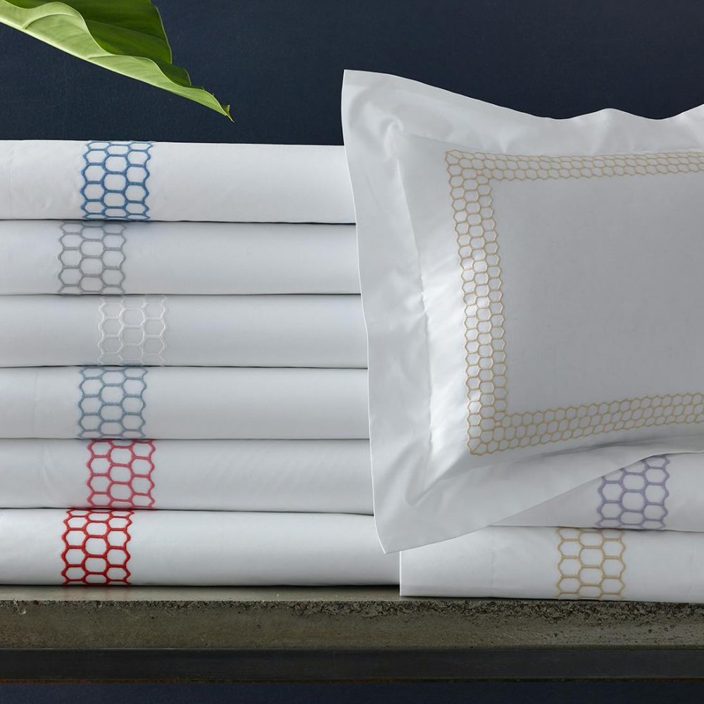 Large scale honeycomb pattern embroidery. 520 threadcount White cotton percale. Duvet Covers have embroidery running head to foot.