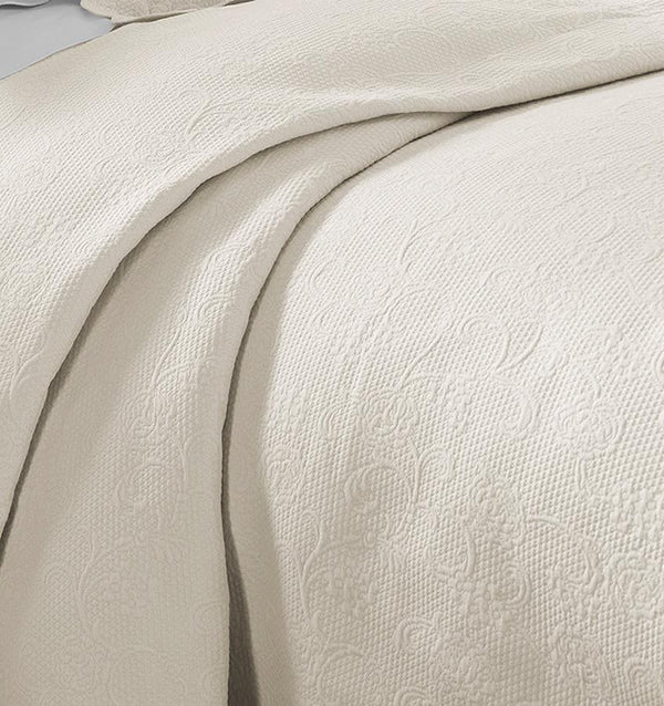 In the classic tradition of matelasses, a subtle raised pattern of flowers and vines is set against a textured ground, all woven from soft Egyptian cotton. Scalloped edges finish the blanket covers and pillow shams.