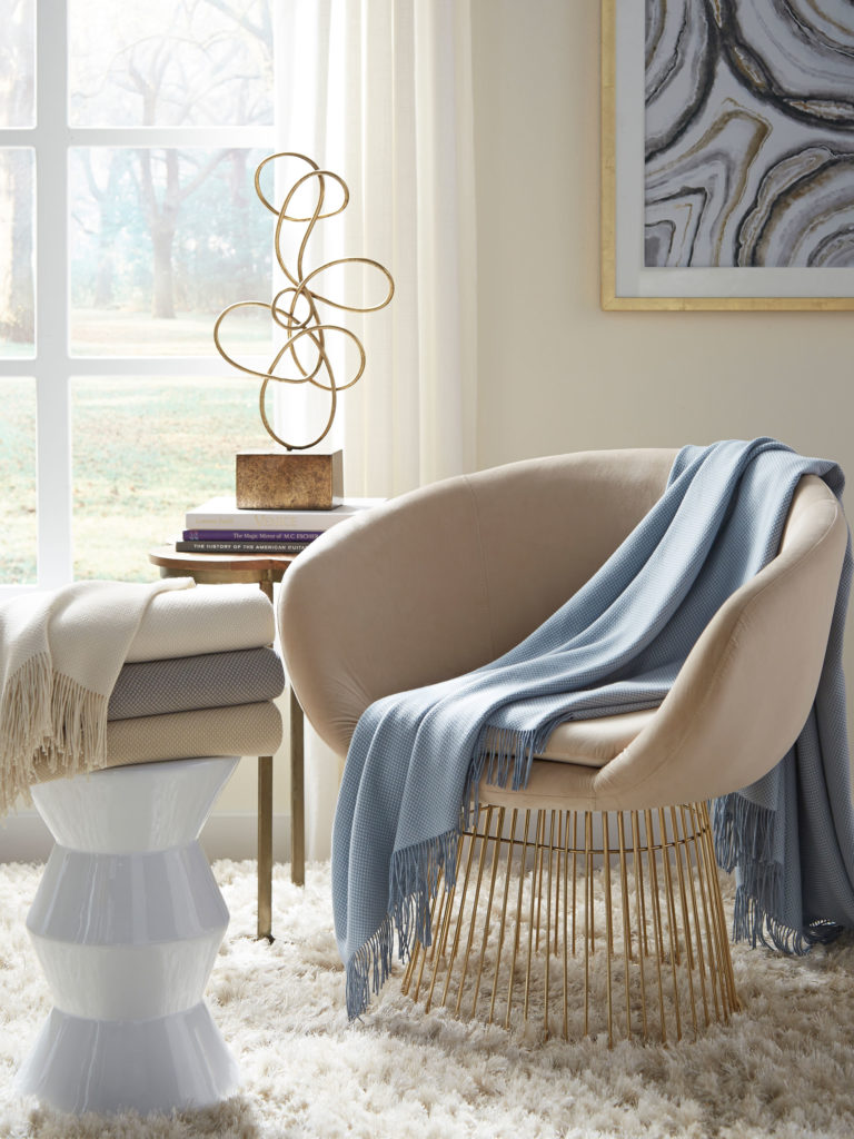 This elegantly tailored throw blends pima cotton and alpaca in a soft, lustrous weave. It is light in weight but the silken fleece of the alpaca makes it invitingly warm as well. Two quietly harmonious colors are interwoven in a flat basketweave pattern and finished with a hand-knotted fringe.