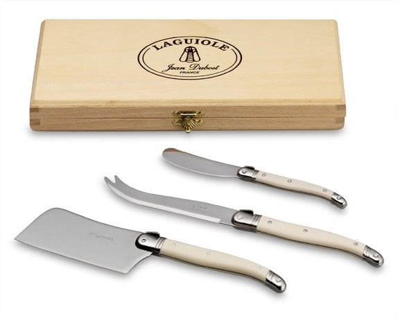 Set of three cheese knives- each knife has a customized stainless-steel blade: a forked blade for semisoft cheeses, a pointed blade for hard cheeses and a wide blade for semi-hard cheeses.