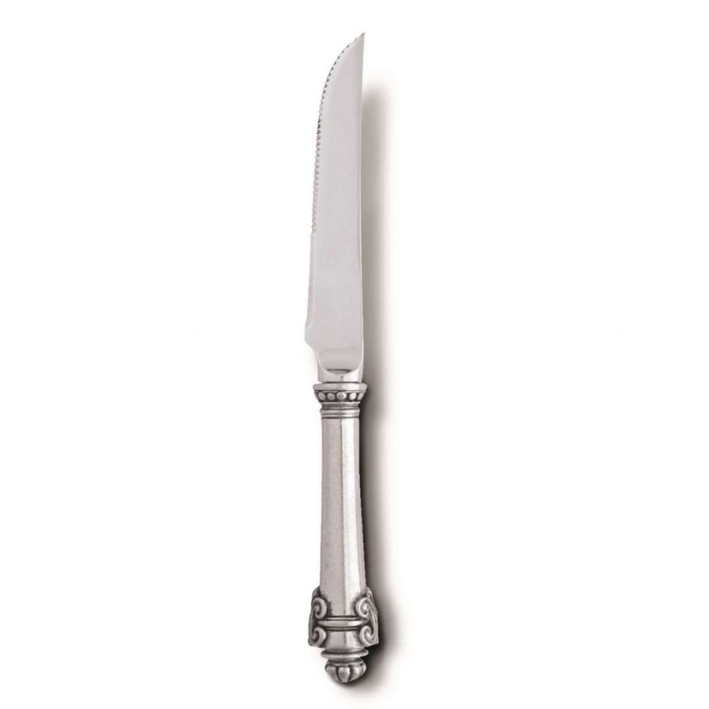 This Vagabond House steak knife set depicts the noble lifestyle of the Medici family within its traditional design. Reminiscent of a fleur-de-lis symbol, elegant flourishes adorn the end cap and both sides of each handle, while beaded patterns surround a guard just below each piece’s neck. Exquisitely detailed in pewter, each handle provides a sturdy base for the stainless steel blade.